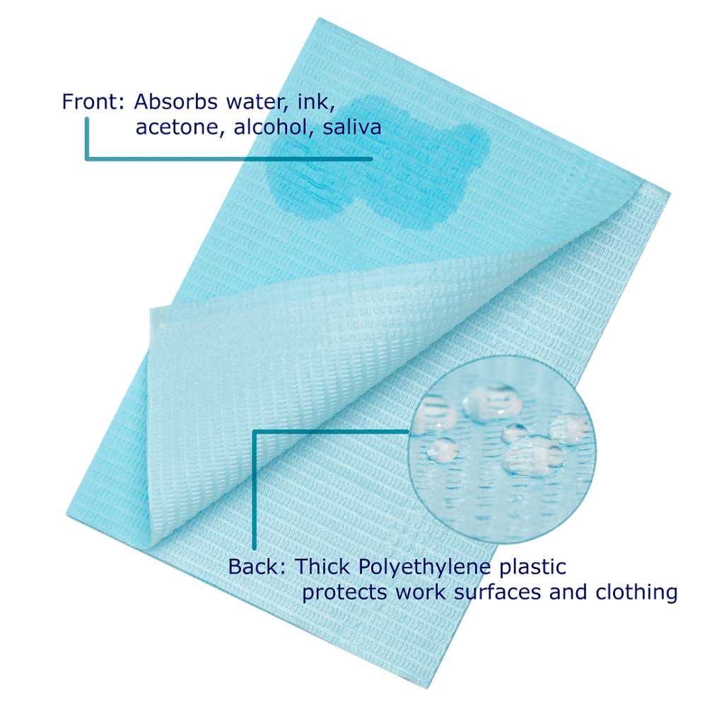 Our disposable dental bibs are leak resistant against acetone, rubbing alcohol, tattoo ink, water, and saliva.